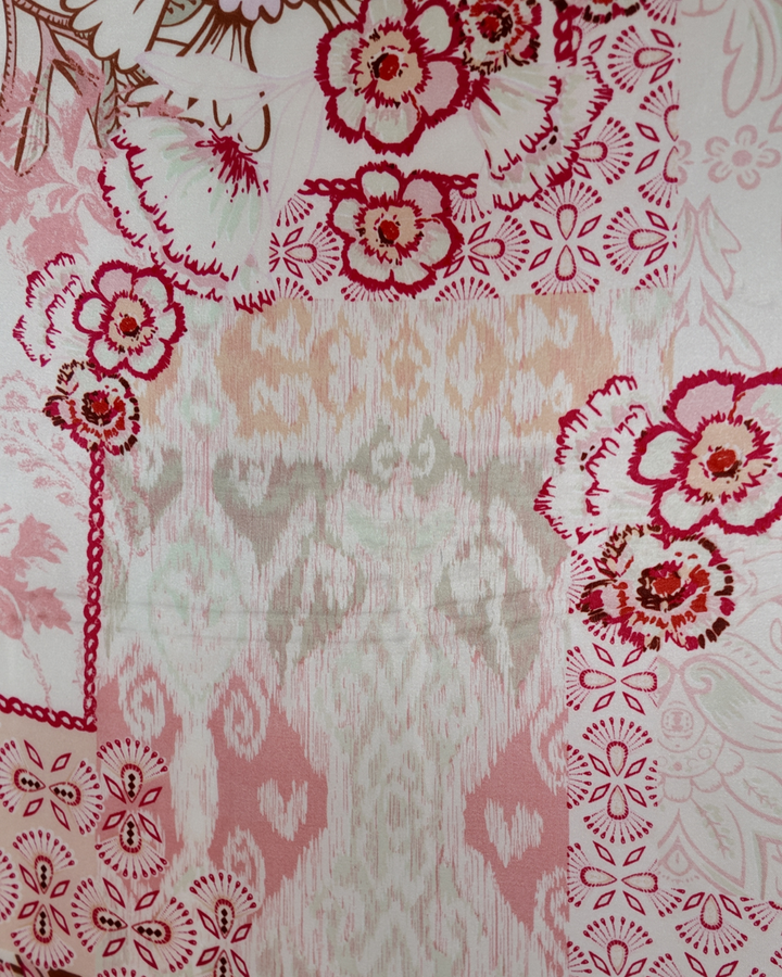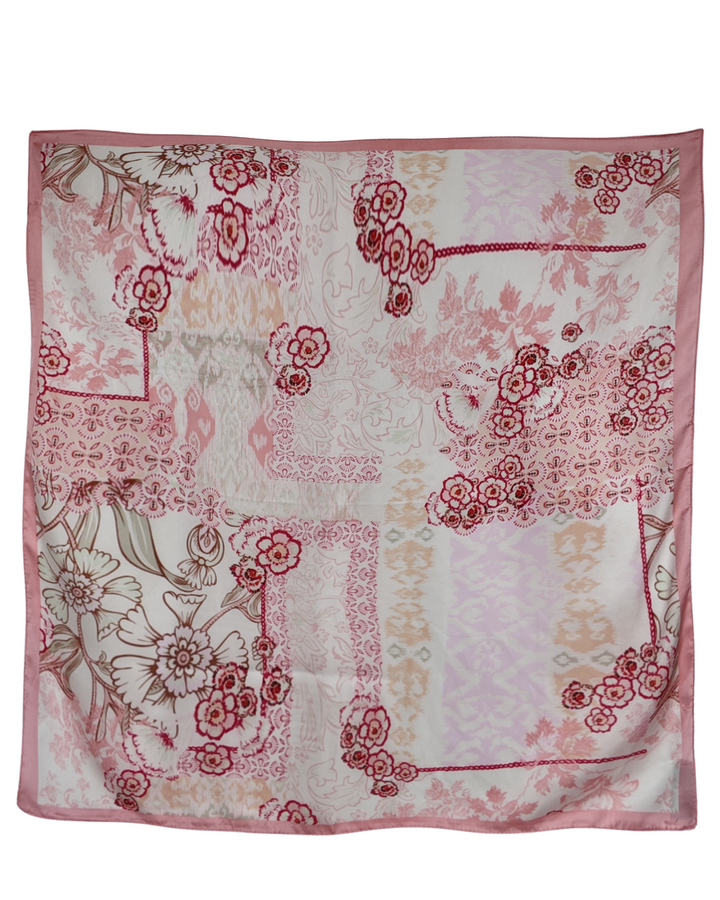 Romantic and effortlessly chic, the Rosé Patchwork Silk Scarf blends artistry with elegance. Featuring a soft patchwork design in shades of blush pink, dusty rose, cream, and deep red, delicately accented with floral motifs, this scarf is a celebration of feminine charm.