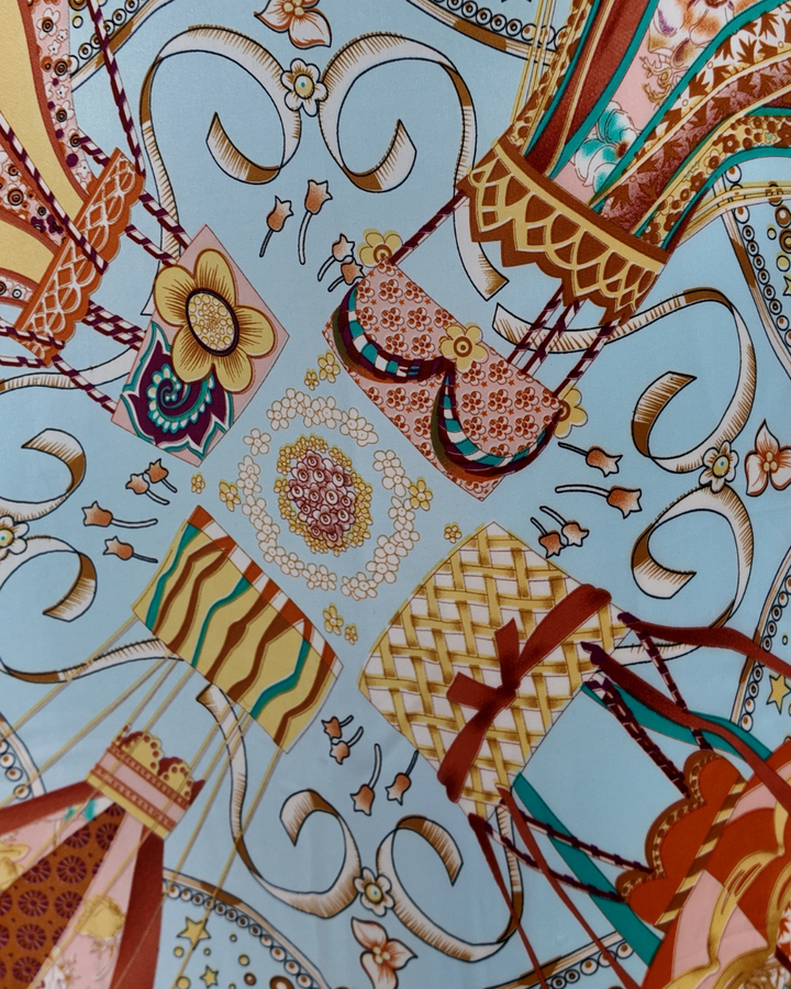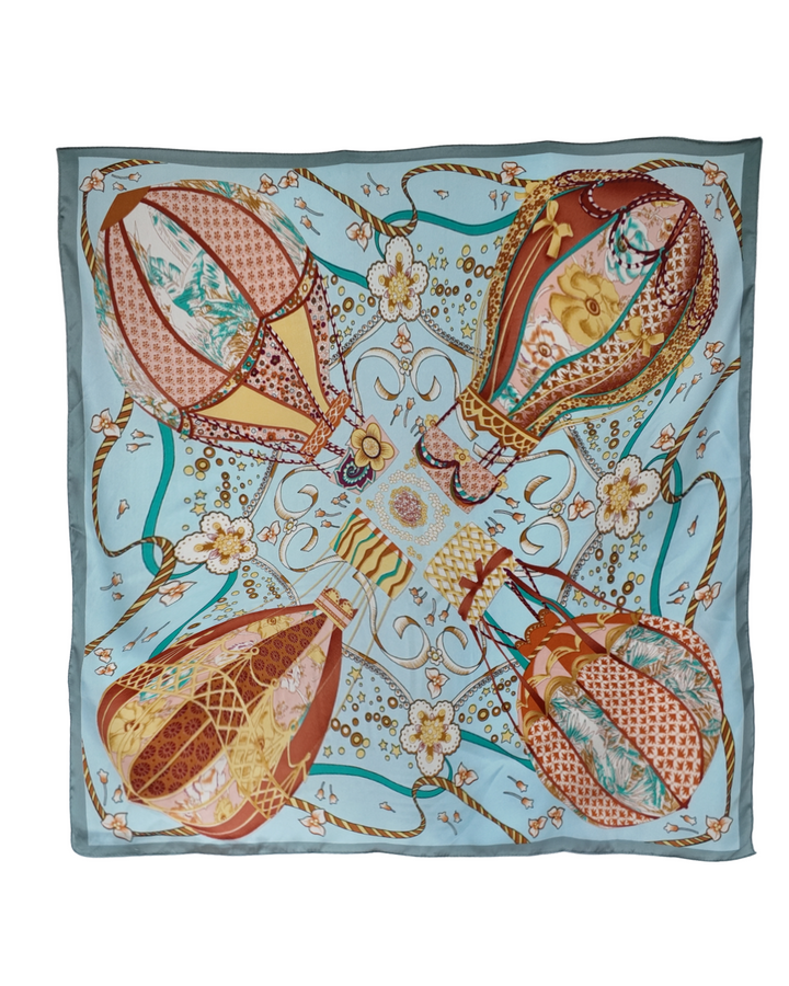 Take your style to new heights with the Sky Journey Silk Scarf, a beautifully detailed design inspired by the romance of travel. Featuring intricate hot air balloon motifs in warm gold, caramel, and blush tones against a soft sky‑blue backdrop, this scarf captures a sense of wanderlust and timeless elegance.